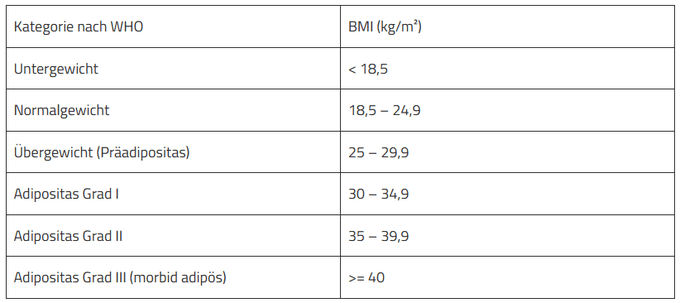 Man teilt die Adipositas in mehrere Stufen ein. Die gängige WHO Einstufung ist wie folgt: