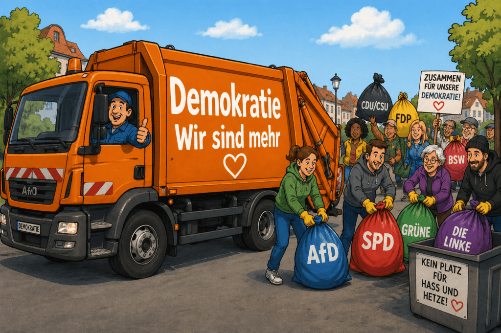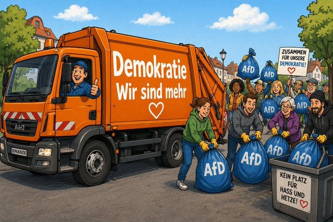 Die AfD als böse, undemokratische, rechtsextreme Parteidarf man komplett in den Mülleimer werfen. Das ist ok, weil die AfD das personifizierte Böse ist und wirklich exklusiv jeder AfDler quasi the devil incarnate ist. Die Guten müssen dagegen stehen und im Zweifel heißt das eben auch, dass man auch und gerade als Guter eben auch mal Menschen als etwas darstellt, das man problemlos mit der Müllabfuhr entsorgen kann. Dass das genau die Art von Diktion ist, gegen die man sich eigentlich zur Wehr setzen möchte, interessiert an der Stelle nicht. Der Zweck heiligt die Mittel.